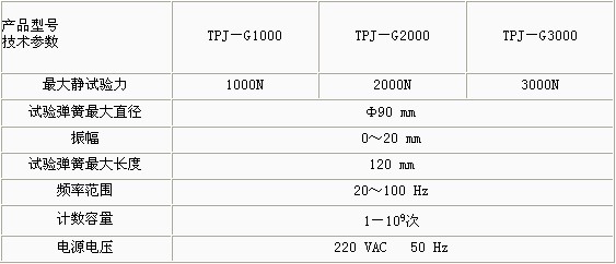 產(chǎn)品概述: TPJ-G系列彈簧高頻疲勞試驗(yàn)機(jī)采用電磁激勵(lì)、試件(彈簧)共振原理,彈簧拉力試驗(yàn)機(jī)價(jià)格,系統(tǒng)自動(dòng)處于最佳諧振狀態(tài),微機(jī)控制彈簧試驗(yàn)機(jī),勿需調(diào)整,起動(dòng)一觸即發(fā),性能穩(wěn)定可靠。操作簡(jiǎn)單,操作人員勿需培訓(xùn)。 功能特點(diǎn): 試驗(yàn)機(jī)設(shè)有振動(dòng)次數(shù)及頻率的數(shù)字顯示及次數(shù)預(yù)置、記憶等功能。該機(jī)既可以做單對(duì)彈簧的試驗(yàn),拉壓彈簧試驗(yàn)機(jī),也可做多對(duì)彈簧的試驗(yàn)機(jī)。 技術(shù)參數(shù):
