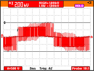 50 Hz馬達驅動輸出電壓的脈寬調(diào)制信號的細節(jié)。1000V,50 微秒的脈沖即導致某些測試設備的不穩(wěn)定。